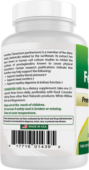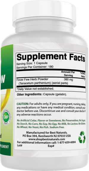 {"id":4525046464649,"title":"Best Naturals Feverfew 380 mg 180 Capsules","handle":"best-naturals-feverfew-380-mg-180-capsules","description":"\u003cul class=\"a-unordered-list a-vertical a-spacing-none\"\u003e\n\u003cli style=\"font-weight: 400;\"\u003e\u003cspan style=\"font-weight: 400;\"\u003e3rd Party Lab Tested for Purity \u0026amp; Quality.\u003c\/span\u003e\u003c\/li\u003e\n\u003cli style=\"font-weight: 400;\"\u003e\u003cspan style=\"font-weight: 400;\"\u003e380 mg of Feverfew per Capsule - 180 Capsules per Bottle.\u003c\/span\u003e\u003c\/li\u003e\n\u003cli style=\"font-weight: 400;\"\u003e\u003cspan style=\"font-weight: 400;\"\u003eNon-GMO \u0026amp; Gluten-Free.\u003c\/span\u003e\u003c\/li\u003e\n\u003cli style=\"font-weight: 400;\"\u003e\u003cspan style=\"font-weight: 400;\"\u003eProudly Made in USA, GMP Compliant, FDA Registered Facility.\u003c\/span\u003e\u003c\/li\u003e\n\u003cli style=\"font-weight: 400;\"\u003e\u003cspan style=\"font-weight: 400;\"\u003eNo Artificial Color, Flavor, or Sweetener, No Preservatives, No Sugar, No Milk, No Corn, No Soy, No Egg, No Lactose, No Gluten, No Wheat, No Yeast, No Fish. Sodium Free.\u003c\/span\u003e\u003c\/li\u003e\n\u003c\/ul\u003e","published_at":"2020-02-02T02:21:52-05:00","created_at":"2020-02-02T02:29:56-05:00","vendor":"shopbestnaturals.com","type":"","tags":["Herbal Products"],"price":1000,"price_min":1000,"price_max":1000,"available":true,"price_varies":false,"compare_at_price":2199,"compare_at_price_min":2199,"compare_at_price_max":2199,"compare_at_price_varies":false,"variants":[{"id":32056426922121,"title":"Default Title","option1":"Default Title","option2":null,"option3":null,"sku":"817716014395","requires_shipping":true,"taxable":false,"featured_image":null,"available":true,"name":"Best Naturals Feverfew 380 mg 180 Capsules","public_title":null,"options":["Default Title"],"price":1000,"weight":122,"compare_at_price":2199,"inventory_management":"shopify","barcode":"817716014395","requires_selling_plan":false,"selling_plan_allocations":[]}],"images":["\/\/shopbestnaturals-com.myshopify.com\/cdn\/shop\/products\/Image-1_8bdf5200-cd3b-4183-ae97-2a6c01c98087.jpg?v=1749675680","\/\/shopbestnaturals-com.myshopify.com\/cdn\/shop\/files\/Image-4_6c6e4820-76d8-419c-8f91-e3afe34d155d.jpg?v=1757443389","\/\/shopbestnaturals-com.myshopify.com\/cdn\/shop\/files\/Image-5_fd327e67-0367-4d08-90b5-34ea09c14e88.jpg?v=1757443389","\/\/shopbestnaturals-com.myshopify.com\/cdn\/shop\/files\/Image-6_49405085-c4bd-4f62-80f2-b0d0efc2785e.jpg?v=1757443390","\/\/shopbestnaturals-com.myshopify.com\/cdn\/shop\/files\/Image-7_987ea5b4-2e5b-48a5-910f-653386a4740d.jpg?v=1757443389","\/\/shopbestnaturals-com.myshopify.com\/cdn\/shop\/files\/Image-2_b2d4fd3f-b545-4e96-8646-ec7398fdfc38.png?v=1757443389","\/\/shopbestnaturals-com.myshopify.com\/cdn\/shop\/files\/Image-3_6d0218f1-ffe2-4bbe-b6be-a81e04456fe1.png?v=1757443389"],"featured_image":"\/\/shopbestnaturals-com.myshopify.com\/cdn\/shop\/products\/Image-1_8bdf5200-cd3b-4183-ae97-2a6c01c98087.jpg?v=1749675680","options":["Title"],"media":[{"alt":null,"id":31057753931993,"position":1,"preview_image":{"aspect_ratio":0.515,"height":2585,"width":1330,"src":"\/\/shopbestnaturals-com.myshopify.com\/cdn\/shop\/products\/Image-1_8bdf5200-cd3b-4183-ae97-2a6c01c98087.jpg?v=1749675680"},"aspect_ratio":0.515,"height":2585,"media_type":"image","src":"\/\/shopbestnaturals-com.myshopify.com\/cdn\/shop\/products\/Image-1_8bdf5200-cd3b-4183-ae97-2a6c01c98087.jpg?v=1749675680","width":1330},{"alt":null,"id":37717693989081,"position":2,"preview_image":{"aspect_ratio":1.0,"height":1500,"width":1500,"src":"\/\/shopbestnaturals-com.myshopify.com\/cdn\/shop\/files\/Image-4_6c6e4820-76d8-419c-8f91-e3afe34d155d.jpg?v=1757443389"},"aspect_ratio":1.0,"height":1500,"media_type":"image","src":"\/\/shopbestnaturals-com.myshopify.com\/cdn\/shop\/files\/Image-4_6c6e4820-76d8-419c-8f91-e3afe34d155d.jpg?v=1757443389","width":1500},{"alt":null,"id":37717694021849,"position":3,"preview_image":{"aspect_ratio":1.0,"height":1500,"width":1500,"src":"\/\/shopbestnaturals-com.myshopify.com\/cdn\/shop\/files\/Image-5_fd327e67-0367-4d08-90b5-34ea09c14e88.jpg?v=1757443389"},"aspect_ratio":1.0,"height":1500,"media_type":"image","src":"\/\/shopbestnaturals-com.myshopify.com\/cdn\/shop\/files\/Image-5_fd327e67-0367-4d08-90b5-34ea09c14e88.jpg?v=1757443389","width":1500},{"alt":null,"id":37717694054617,"position":4,"preview_image":{"aspect_ratio":1.0,"height":1500,"width":1500,"src":"\/\/shopbestnaturals-com.myshopify.com\/cdn\/shop\/files\/Image-6_49405085-c4bd-4f62-80f2-b0d0efc2785e.jpg?v=1757443390"},"aspect_ratio":1.0,"height":1500,"media_type":"image","src":"\/\/shopbestnaturals-com.myshopify.com\/cdn\/shop\/files\/Image-6_49405085-c4bd-4f62-80f2-b0d0efc2785e.jpg?v=1757443390","width":1500},{"alt":null,"id":37717694087385,"position":5,"preview_image":{"aspect_ratio":1.0,"height":1500,"width":1500,"src":"\/\/shopbestnaturals-com.myshopify.com\/cdn\/shop\/files\/Image-7_987ea5b4-2e5b-48a5-910f-653386a4740d.jpg?v=1757443389"},"aspect_ratio":1.0,"height":1500,"media_type":"image","src":"\/\/shopbestnaturals-com.myshopify.com\/cdn\/shop\/files\/Image-7_987ea5b4-2e5b-48a5-910f-653386a4740d.jpg?v=1757443389","width":1500},{"alt":null,"id":37717694120153,"position":6,"preview_image":{"aspect_ratio":0.523,"height":1500,"width":785,"src":"\/\/shopbestnaturals-com.myshopify.com\/cdn\/shop\/files\/Image-2_b2d4fd3f-b545-4e96-8646-ec7398fdfc38.png?v=1757443389"},"aspect_ratio":0.523,"height":1500,"media_type":"image","src":"\/\/shopbestnaturals-com.myshopify.com\/cdn\/shop\/files\/Image-2_b2d4fd3f-b545-4e96-8646-ec7398fdfc38.png?v=1757443389","width":785},{"alt":null,"id":37717694185689,"position":7,"preview_image":{"aspect_ratio":0.523,"height":1500,"width":785,"src":"\/\/shopbestnaturals-com.myshopify.com\/cdn\/shop\/files\/Image-3_6d0218f1-ffe2-4bbe-b6be-a81e04456fe1.png?v=1757443389"},"aspect_ratio":0.523,"height":1500,"media_type":"image","src":"\/\/shopb