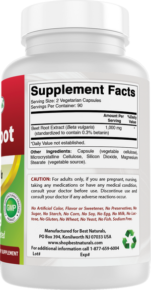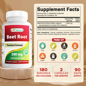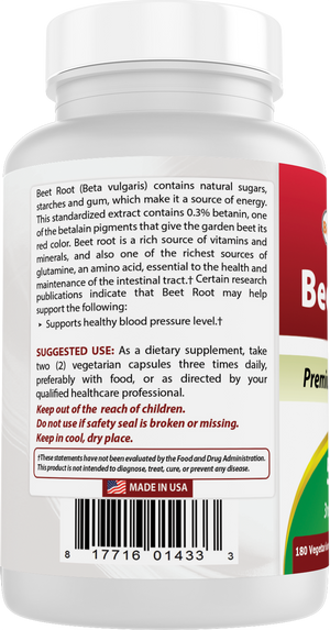 • 500 mg of Beet Root per Vegetarian Capsule - 180 Capsules per Bottle.